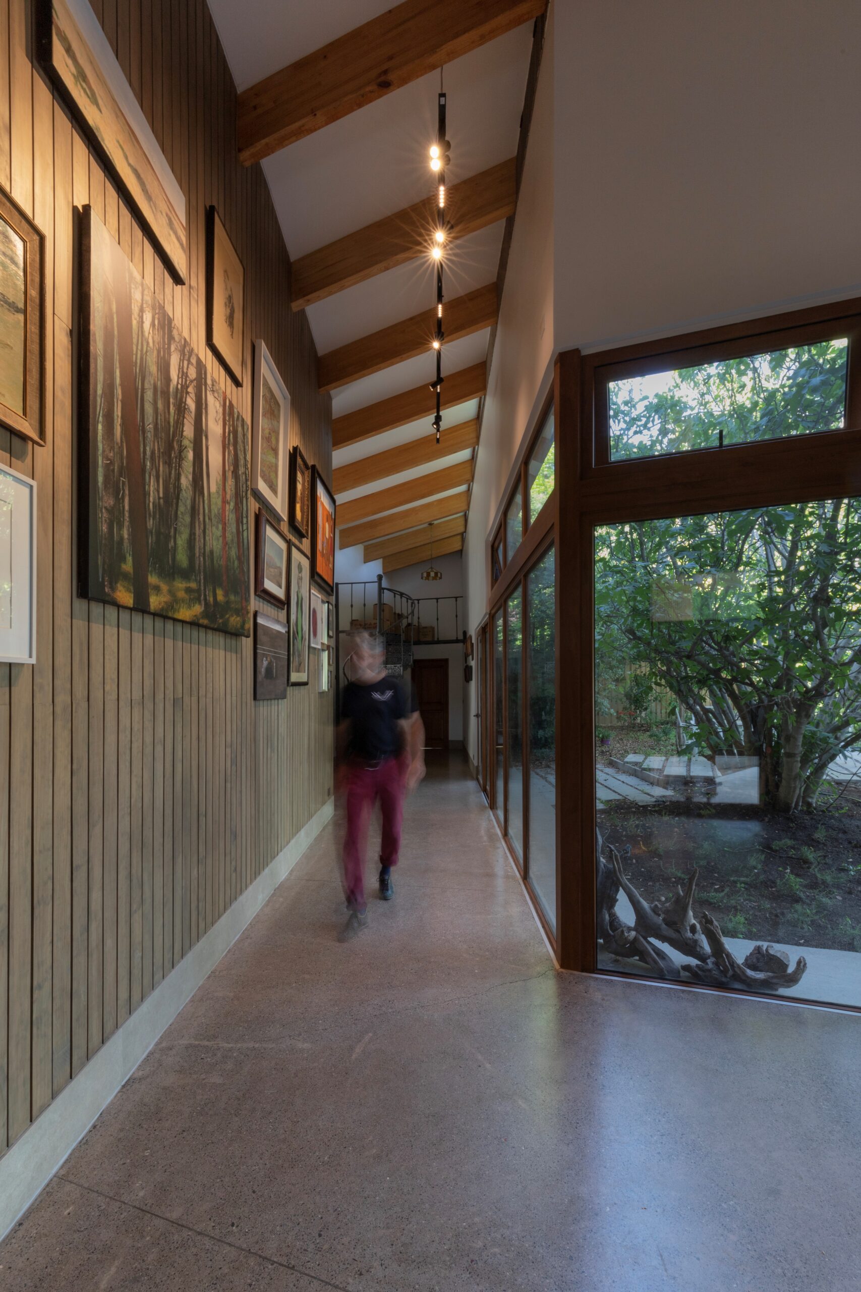 Sin embargo, esta dureza exterior es una cáscara. Al deslizarse los ventanales, la arquitectura revela su reverso: un interior de madera termotratada que emite un resplandor ámbar, recortando la escena doméstica contra la oscuridad del cerro. La cocina y el comedor no son simples habitaciones, sino un tableau iluminado, un escenario de calidez que contrasta violentamente con la intemperie circundante. El vidrio deja de ser una barrera para convertirse en una lente que expone la vida familiar, mientras que en otros ángulos, captura el reflejo de la vegetación circundante, fundiendo el árbol y la casa en una misma imagen espectral.