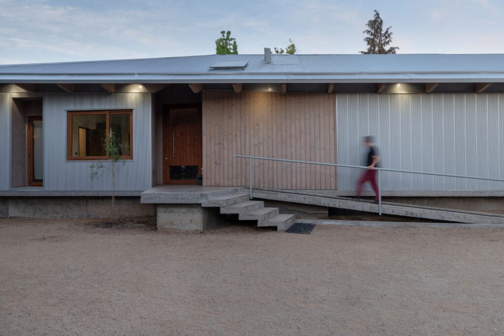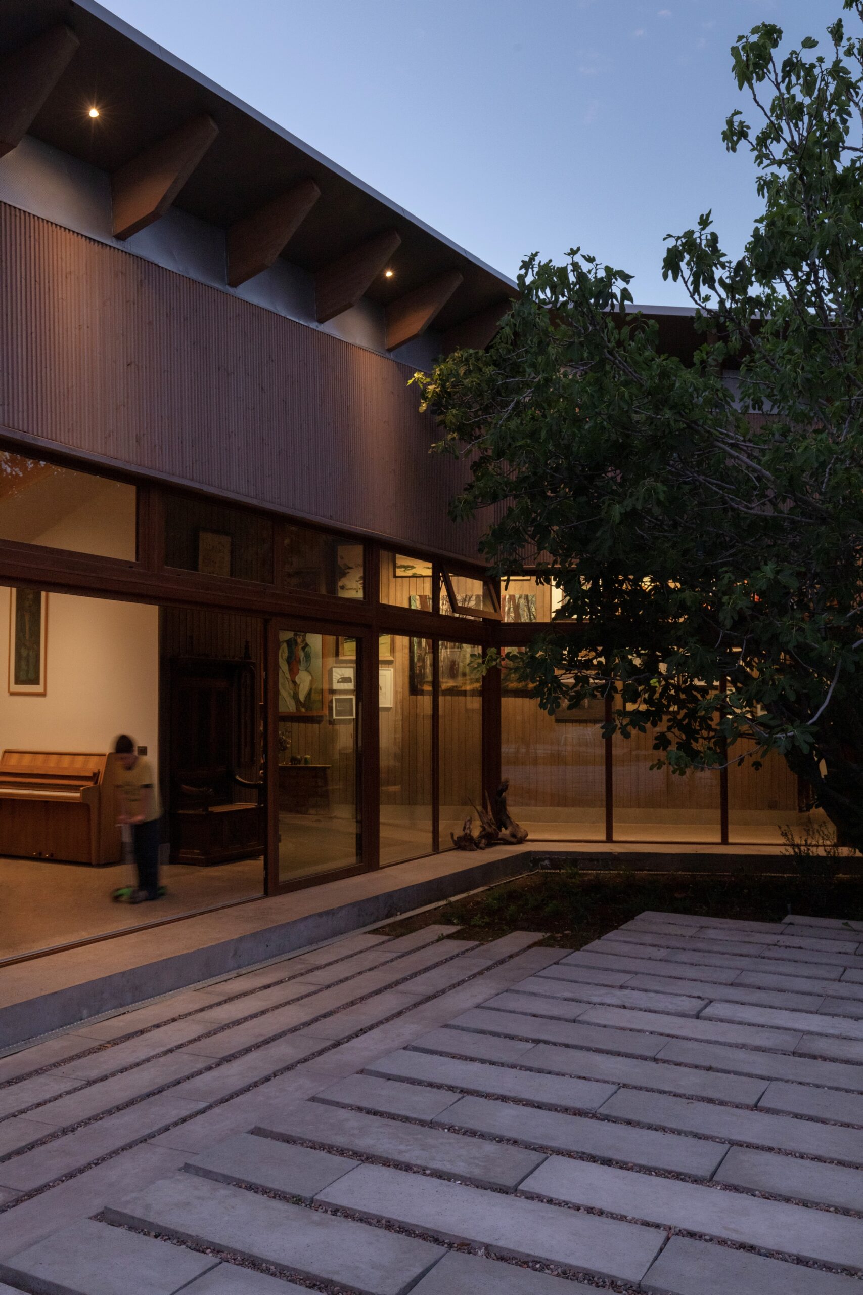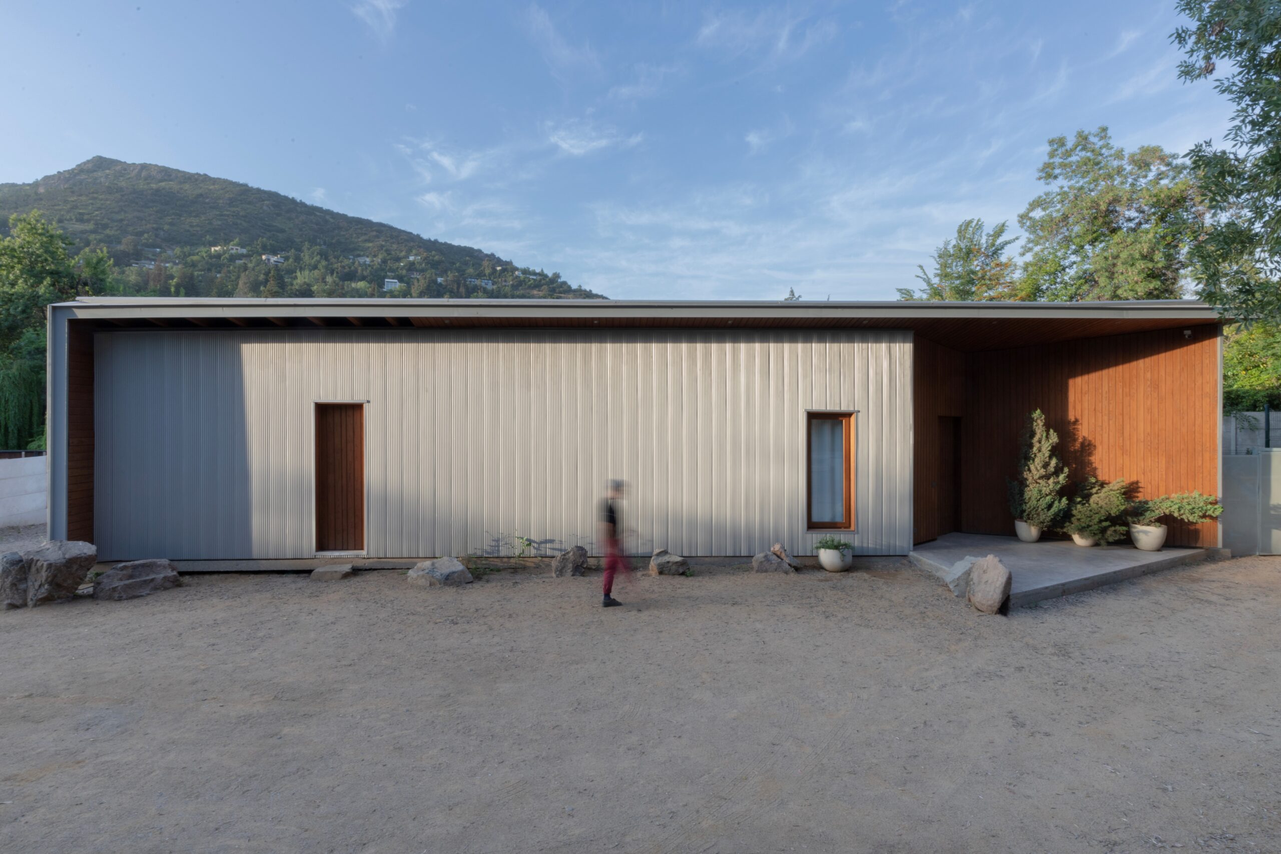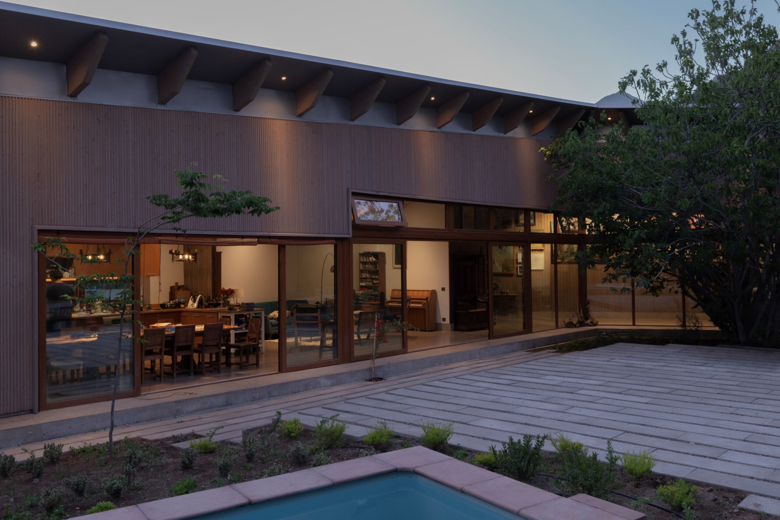 El proyecto se posa sobre la ladera del Manquehue como un mecanismo de precisión. La metáfora de las alas delta se materializa aquí en una cubierta de profundos aleros, donde la estructura de vigas de madera queda expuesta, marcando un ritmo esquelético bajo la piel protectora. El revestimiento de aluminio acanalado funciona como una armadura vertical; una superficie hermética y fría que, al caer la tarde, parece absorber la luz azulada del entorno, negando cualquier ornamento que no sea su propia textura industrial.