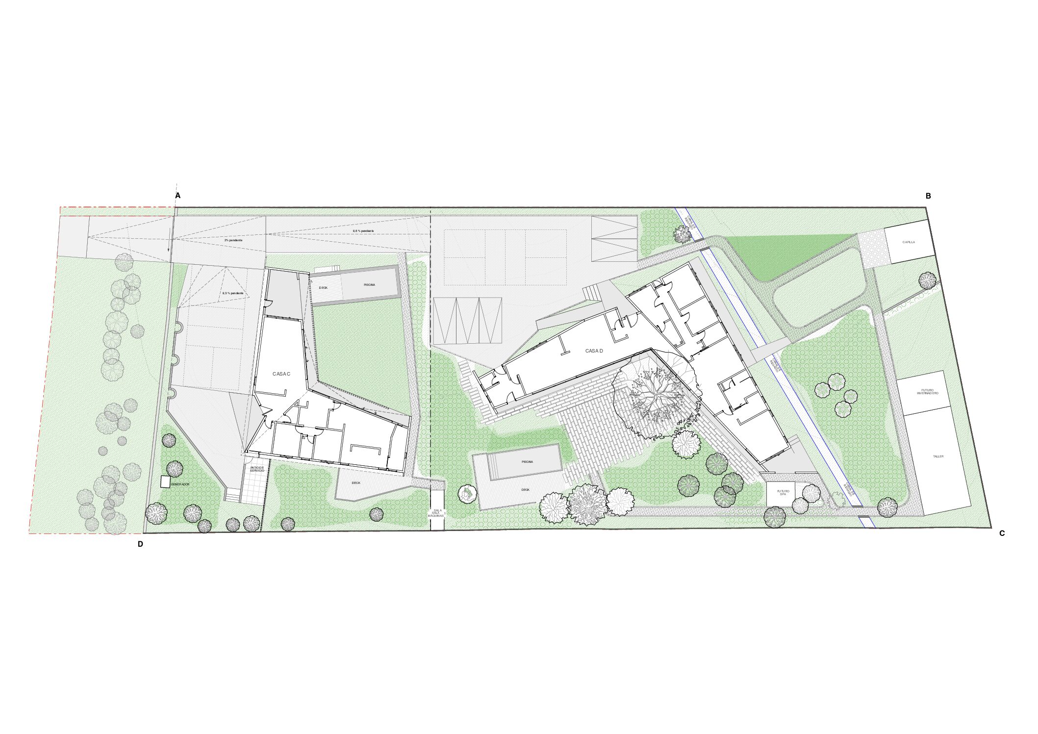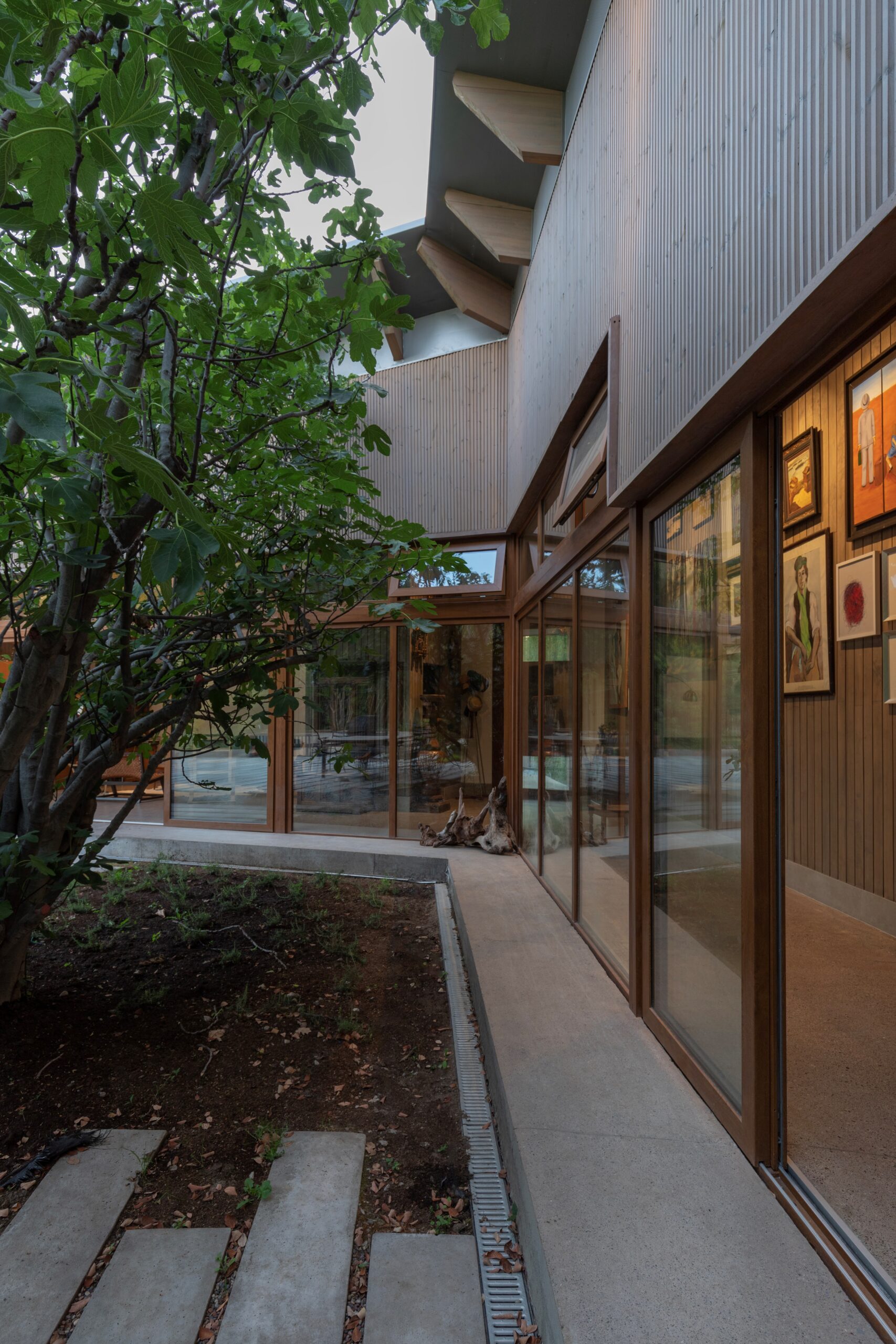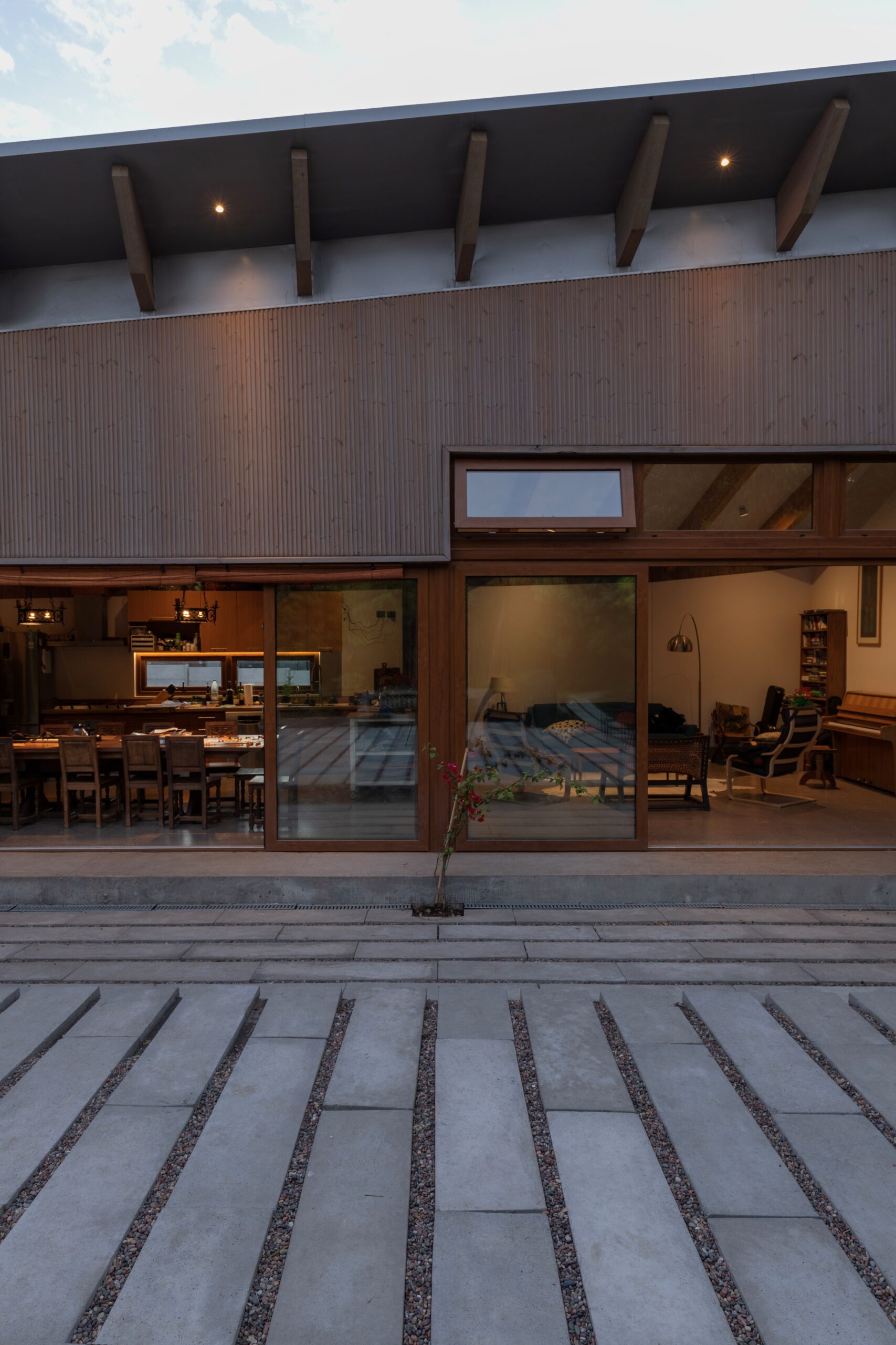 El suelo exterior, resuelto en placas de hormigón estriado, repite la geometría lineal de la fachada, permitiendo que la tierra respire entre las juntas. Es una intervención que organiza el terreno sin sellarlo. En su disposición helicoidal, las dos casas —la principal y su eco para la renta— negocian su privacidad no mediante muros ciegos, sino a través de la orientación. Conviven en la misma ladera, compartiendo materiales y lenguaje, pero manteniéndose en una soledad acompañada, unidas por la tensión de ser idénticas y, a la vez, ajenas.