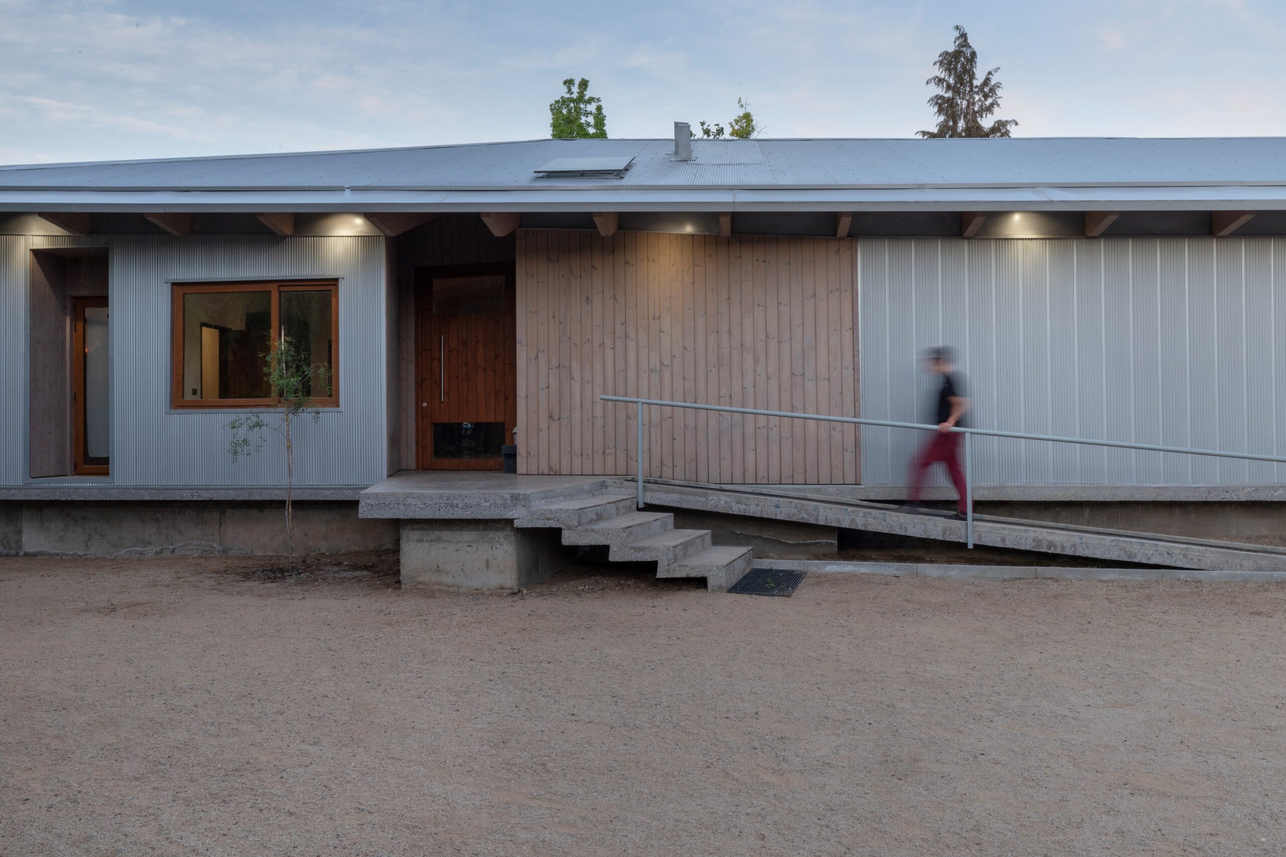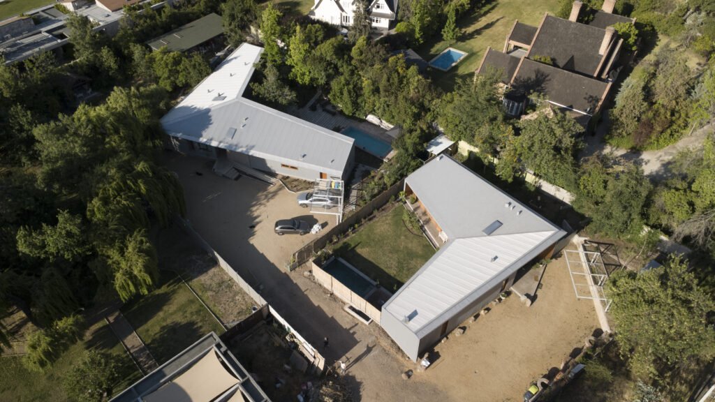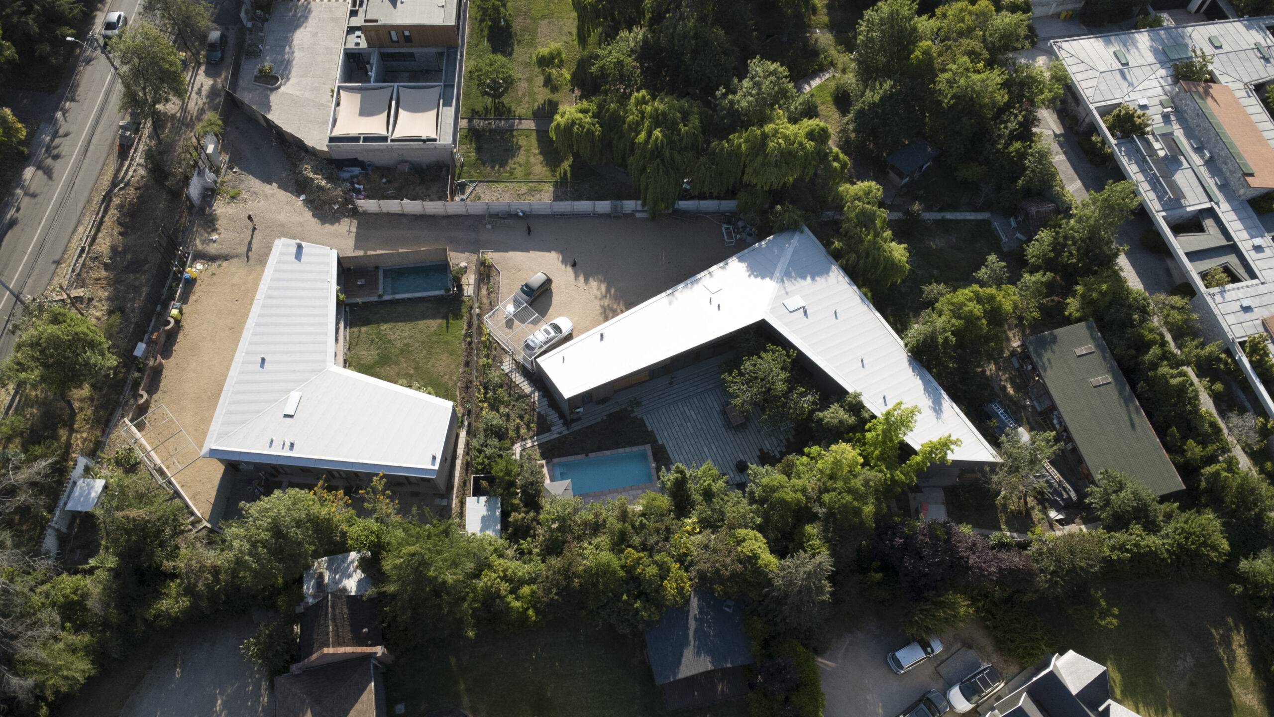 Una casa para una familia de 6 personas y otra de arriendo, ambas con un ADN similar. Hermanas en el partido general, en “V” y materialidades: plancha ondulada de aluminio, madera termotratada y hormigón pulido.